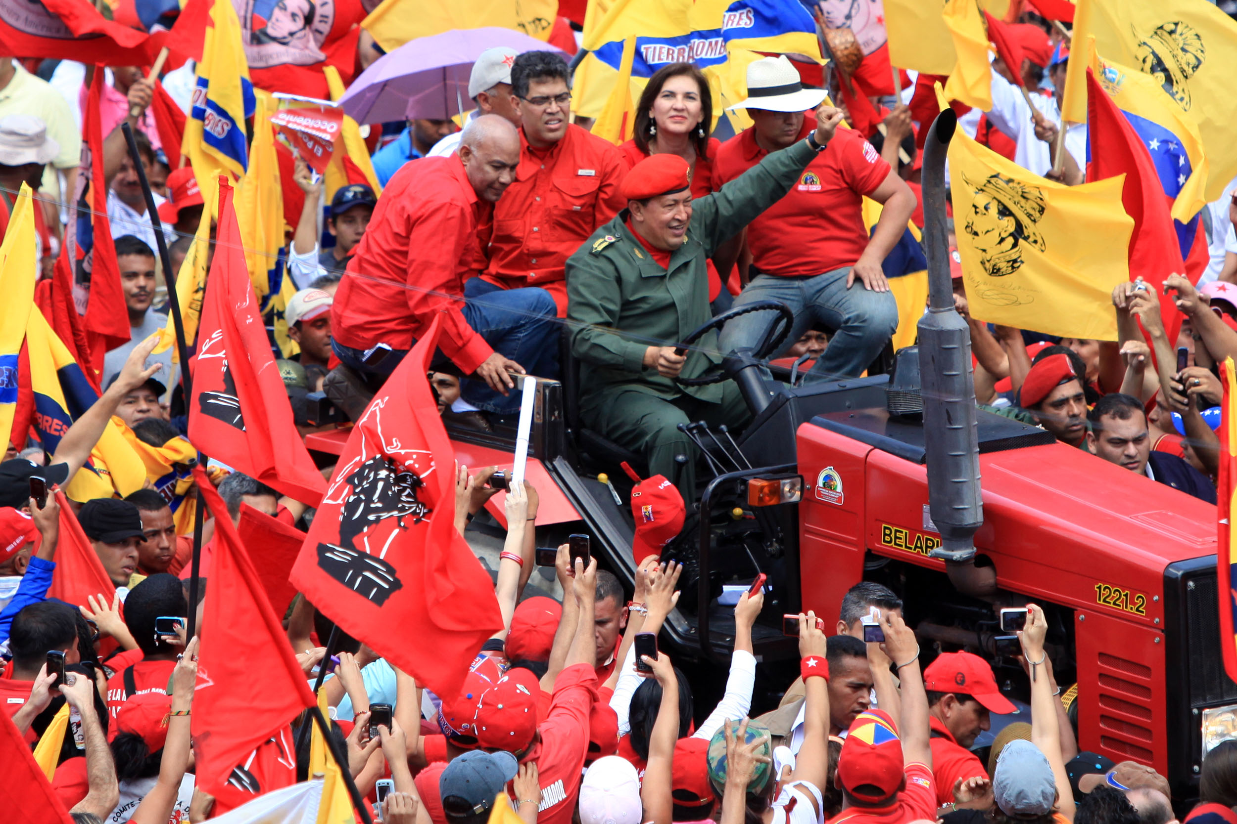 El Presidente Chávez conduce, en un tractor bielorruso, hasta el Parque El Calvario 21 febrero, 2010 • 0 Comentarios Esta noticia fue publicada hace mucho tiempo Usted está leyendo una publicación de nuestros archivos de noticias, hecha hace 14 años. Cerciórece siempre de la fecha de publicación de una noticia y no permita que personas inescrupulosas la hagan pasar como actual. Pasa entre una multitud de personas. Foto: ABN