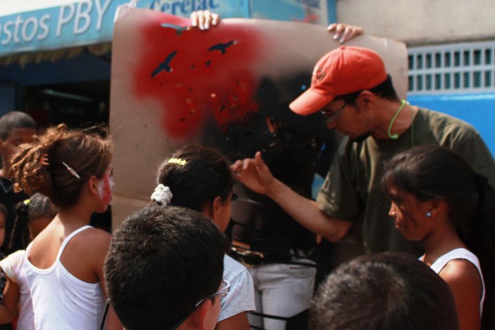 Grafiteros explican a niños de La Bombilla cómo hacer "stencils" o plantillas para pintas en las paredes. Foto: Gipsy Gastello