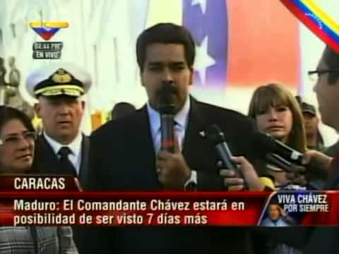 El líder de la Revolución Bolivariana, Hugo Chávez, podrá ser visto por su pueblo durante siete días más, anunció este jueves el presidente encargado Nicolás Maduro. “El comandante Chávez va a estar en posibilidad de ser visto por lo menos siete días más, para que el pueblo lo pueda ver sin ninguna limitación”, informó en un contacto con Venezolana de Televisión (VTV). Posteriormente, el ministro Jorge Arreaza especificó que la capilla ardiente se realizará en la Academia Militar. Maduro anunció además que “se decidió preparar el cuerpo de Chávez y embalsamarlo para que quede abierto eternamente”, lo que se realizará en el Cuartel de la Montaña, antiguo Museo Histórico Militar, ubicado en la parroquia 23 de Enero, en Caracas.