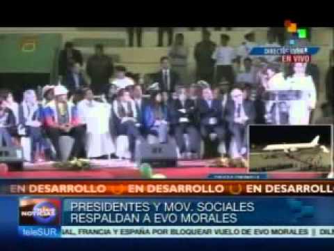 Ante miles de personas congregadas en Cochabamba, la presidenta Cristina Fernández y los presidentes Nicolás Maduro y Rafael Correa brindaron todo su apoyo al jefe de Estado boliviano, Evo Morales, luego de que su avión tuviese que aterrizar de emergencia en Austria tras la repentina negativa de cuatro países europeos de darle permiso de sobrevuelo. El presidente Morales narró cómo ocurrieron los hechos con diplomáticos españoles, denunciando que el embajador español en Austria les presionó fuertemente para revisar el avión a órdenes de un vicecanciller español. Morales responsabiliza a los Estados Unidos de ordenar el bloqueo y estudia la posibilidad de cerrar la embajada de Estados Unidos en su país.