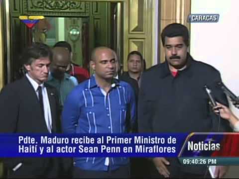 El primer ministro de Haití, Laurent Lamothe, el actor y director de Hollywood, Sean Penn y el mandatario venezolano, Nicolás Maduro, se reunieron este domingo en el Palacio de Miraflores. Ambas personalidades fueron recibidos por el embajador de Venezuela en Caricom, Raúl Licausi y el embajador postulado de Venezuela ante Estados Unidos, Maximillian Arveláez. El actor estadounidense dictará clases de actuación a los jóvenes venezolanos, a través de la Fundación La Villa del Cine, anunció el presidente Maduro. Haití producirá tabletas para estudiantes universitarios de Venezuela.