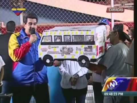 Un chofe, miembro de un consejo comunal en la parroquia Caricuao (suroeste de Caracas) le regala al Presidente Maduro un autobús de cartón. “Siendo chofer se puede llegar lejos”, le dijo el trabajador en referencia a uno de los empleos previos del presidente venezolano como operador de Metrobús. Foto: Prensa Presidencial