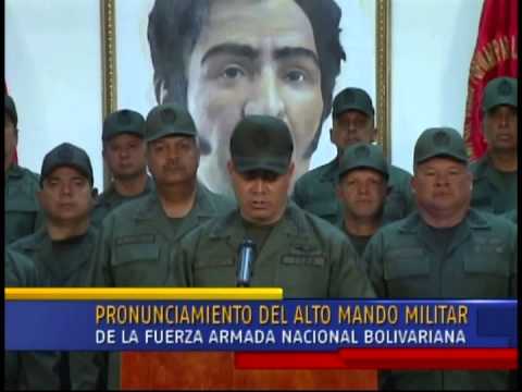 El ministro para la Defensa, Vladimir Padrino López, junto al Alto Mando Militar emitieron un pronunciamento rechazando este jueves el plan de golpe de Estado que un grupo de militares y civiles venezolanos intentaron fraguar, y que fue revelado el 12 de febrero por el Presidente Nicolás Maduro. “Ante los planes desestabilizadores y la conjura continuada que se vienen gestando para evitar el renacimiento, refundación e independencia de la República Bolivariana de Venezuela, en mi condición de Ministro para la Defensa y Comandante Estratégico Operacional de la Fanb acompañado de los señores almirantes y generales del Alto Mando Militar, queremos sumarnos al sentimiento de rechazo contundente que siente la Fuerza Armada Nacional Bolivariana por la conducta de un reducido número de profesionales que no representan el pensar, sentir, y actuar de nuestra institución”, señaló en cadena nacional de radio y televisión.