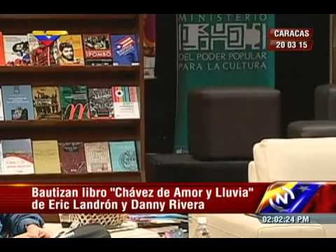 Este viernes 20 de marzo, en la sala José Félix Ribas del Teatro Teresa Carreño, como parte de la serie de actividades que se han desarrollado en la Feria Internacional del Libro de Venezuela (Filven), se bautizó el libro-CD Chávez de amor y de lluvia, de la mano de sus autores, el poeta Eric Landrón y el cantante Danny Rivera. A este acto asistieron el ministro del Poder Popular para la Cultura, Reinaldo Iturriza; el Jefe del Gobierno de Distrito Capital (GDC), Ernesto Villegas, la directora del Centro Nacional del Libro, Chirstien Valles; y el presidente del Teatro Teresa Carreño, Gustavo Arreaza. Este bautizo fue un banquete cultural, pues los autores, ambos puertorriqueños, ambos grandes artistas, deleitaron al público con declamaciones de los textos del libro y con canciones. Un sentido homenaje a quien se lo merece.