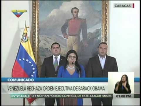 La ministra para Relaciones Exteriores, Delcy Rodríguez, dio a conocer este viernes la posición del Gobierno venezolano ante la renovación de la orden ejecutiva dictada por el presidente de Estados Unidos, Barack Obama, contra Venezuela, indicando que Venezuela repudia dicha decisión y se revisarán las relaciones bilaterales. La Canciller expresó a los medios: “Esto constituye una agresión contra la patria de Simón Bolívar, Hugo Chávez y el pueblo venezolano (…) Estados Unidos desatendió el clamor de los pueblos y gobiernos del mundo que el año pasado se pronunciaron todos en contra de las acusaciones de considera a Venezuela una amenaza”.
