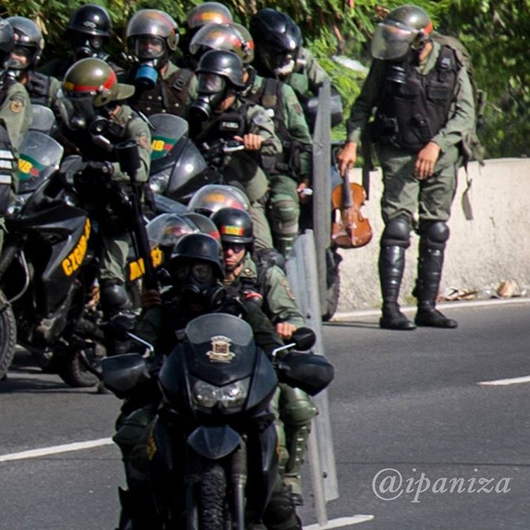 El 25 de mayo, expresó que, mientras tocaba su violín en la manifestación de ese día, “un grupo de motorizados de la GNB arremetió contra mí y uno de ellos me agarró el violín por las cuerdas. Yo no lo solté. Después comenzó a arrastrarme con la moto por toda la avenida y dio la vuelta. Me pasó por encima, me lastimó la pierna y tuve que soltar el violín para cubrirme la cara. Ellos lo agarraron y me quedé como cinco minutos diciéndoles que me lo devolvieran. Uno de los muchachos de la misma GNB se lo quito a otro guardia lo tenía y me lo devolvió destrozado. Le di un abrazo al guardia y salí de ahí”.