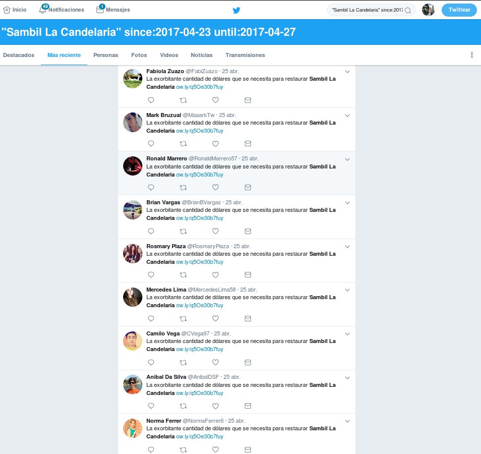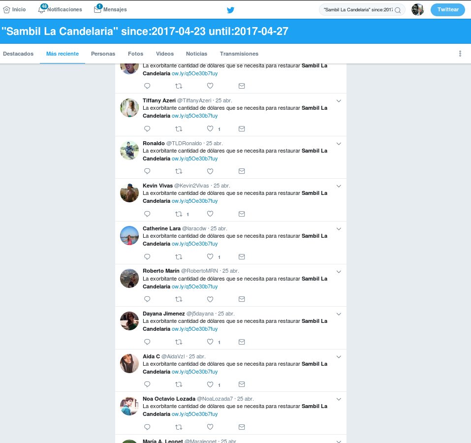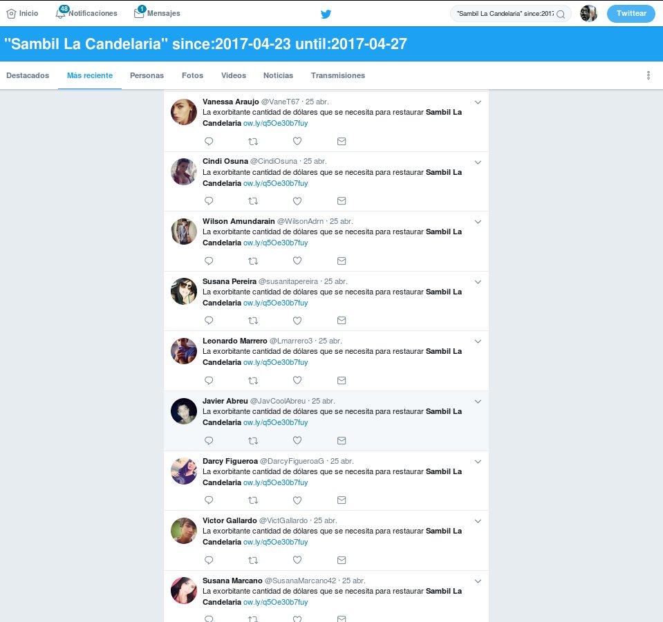Las siguientes capturas muestran, por ejemplo, cómo cientos de bots impulsaron una noticia del sitio web opositor El Cooperante sobre el centro comercial Sambil de La Candelaria el pasado 25 de abril de 2017, un tema que se convirtió en tendencia ese mismo día.