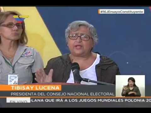 La presidenta del Poder Electoral, Tibisay Lucena, destacó que el ensayo que se desarrolla este domingo en el país ha constatado que el proceso para elegir a los integrantes de la Asamblea Nacional Constituyente (ANC) el próximo 30 de julio es muy sencillo y rápido. “Hemos observado que el tiempo promedio es de 16 segundos frente a la máquina de votación porque es una manera muy sencilla de votar y en la herradura, el tiempo de votación es de menos de un minuto”, precisó desde el Liceo Andrés Bello, en Caracas, donde evaluó el desarrollo de la jornada poco después del mediodía de este domingo.