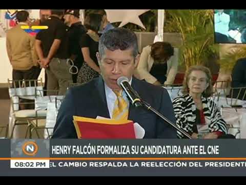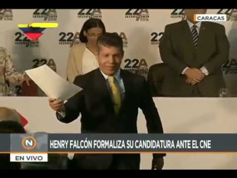El político opositor Henri Falcón formalizó este martes la inscripción de su candidatura presidencial ante el Consejo Nacional Electoral (CNE), con el apoyo de los partidos Copei, MAS, Movimiento Ecologista y Avanzada Progresista, para los comicios del próximo 22 de abril. Los recaudos fueron entregados por Falcón ante la Junta Nacional Electoral, presidida por la también rectora del CNE, Tibisay Lucena, como lo establece el Reglamento de la Ley Orgánica de Procesos Electorales.