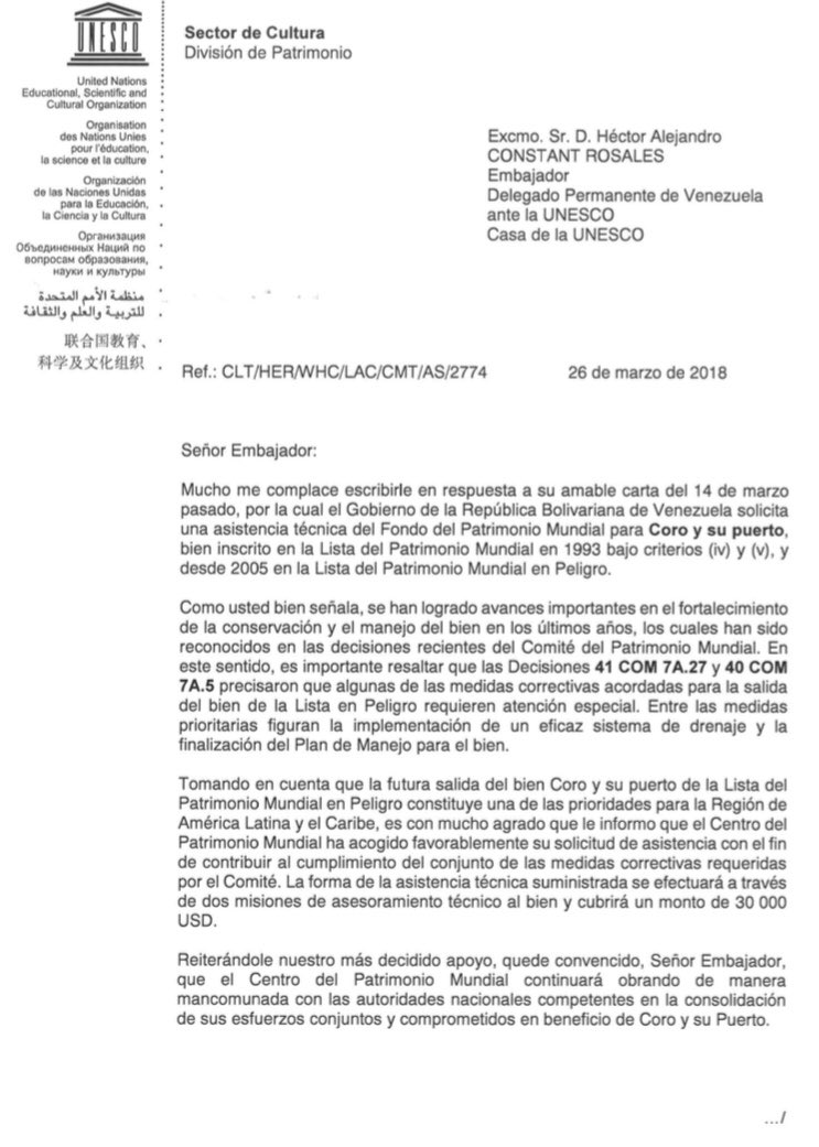 Indica que la salida de Coro y su puerto de la Lista del Patrimonio Mundial en Peligro, es prioridad para la Latinoamérica y el Caribe, por lo que la Unesco acogió satisfactoriamente la solicitud de Venezuela, a los fines de contribuir en el cumplimiento de las medidas correctivas necesarias, garantizando la asistencia técnica a través de dos misiones de asesoramiento.