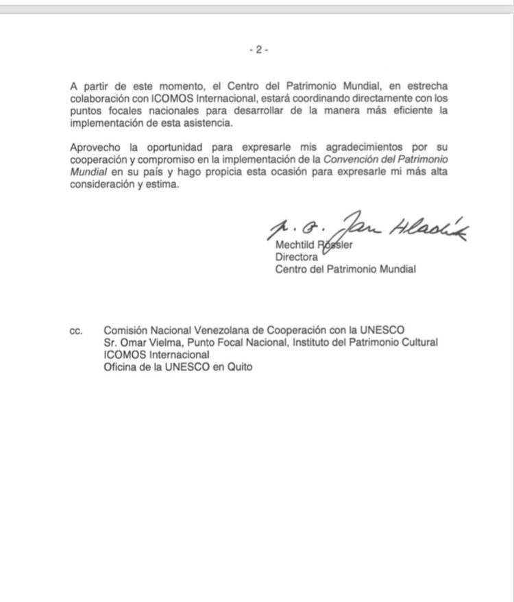 Villegas colgó en la red social un documento suscrito por la directora ese Centro del Patrimonio Mundial, Mechtild Rössler, donde se evidencia que ese organismo activará acciones institucionales, que permitan la salida de este bien patrimonial de la Lista de Patrimonio en Riesgo.