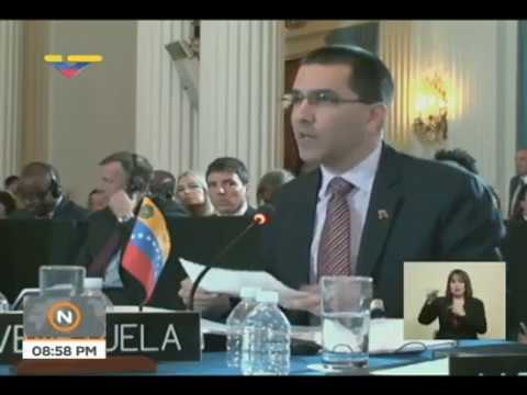 Arreaza rechazó el documento promovido por el gobierno de Estados Unidos. Denunció que la resolución contra Venezuela viola los principios de no intervención de la Carta Interamericana de la OEA y pone en riesgo la seguridad del país. “Esta aprobación, en teoría, le da carta blanca a los Estados Unidos (EEUU) para seguir agrediendo a Venezuela”, advirtió. Recordó cómo el presidente de Estados Unidos dijo públicamente tomar acciones militares contra la patria de Simón Bolívar.