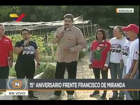 El presidente venezolano, Nicolás Maduro, participó este viernes en un acto en celebración por el décimo quinto aniversario del Frente Francisco de Miranda (FFM), en el Núcleo de Educación Agroecológica Indio Rangel, ubicada en el estado Aragua. El jefe de Estado giró instrucciones al FFM para que seleccione sus mejores cuadros profesionales y los incorpore al proceso de reestructuración de las más de 700 empresas del Estado, con el fin de elevar la producción y frenar la guerra no convencional promovida por sectores económicos de la derecha.