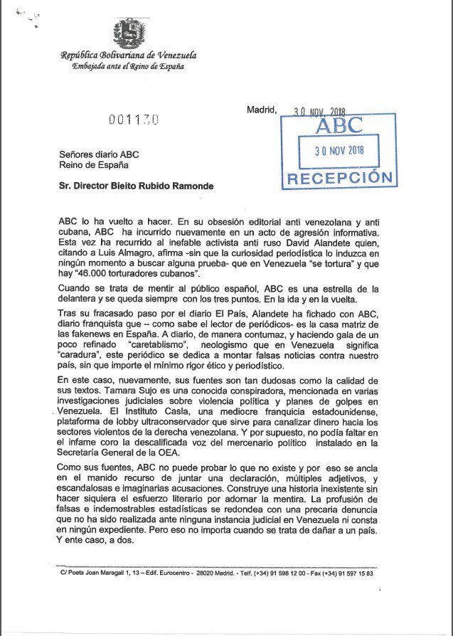 Por su parte, la embajada venezolana en España ha difundido un mensaje donde anexa la carta enviada al medio, destacando que el mismo se negó a publicarla.
