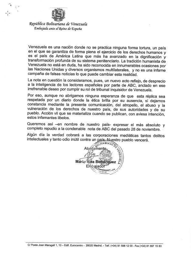 “Venezuela es un país donde no se practica ninguna forma de tortura, un país en el que se garantiza de forma plena el ejercicio de los derechos humanos y es el país de América Latina que más ha avanzado en la dignificación y transformación profunda de su sistema penitenciario”, subraya la misiva firmada por el embajador venezolano, Mario Isea Bohórquez.