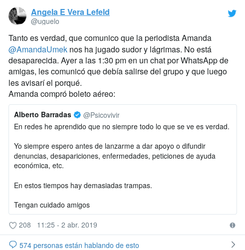 Vera comentó a través de su Twitter que el martes en la tarde tenía información de Amanda Umek, lo que desmontó la versión de su desaparición por parte del SNTP. Umek había comprado un boleto aéreo para salir del país. Complementó argumentando que Pedroza, esposo de Umek, había mentido al gremio irresponsablemente, estimando que la periodista, al no tener visa estadounidense, estaría en México para pedir asilo en Estados Unidos.