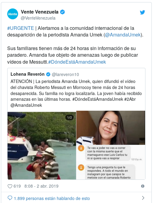 El gremio de periodistas publicó unos mensajes amenazantes (sin aclarar el origen) contra Umek en la red social Instagram, a raíz de unas fotos recientemente publicadas del actor venezolano, Roberto Messuti, que fueron interpretadas como la causa de su desaparición. El razonamiento fue tan automático como falaz: dado que el actor venezolano es chavista, entonces fue el gobierno venezolano quien la secuestró como conclusión de las amenazas recibidas.