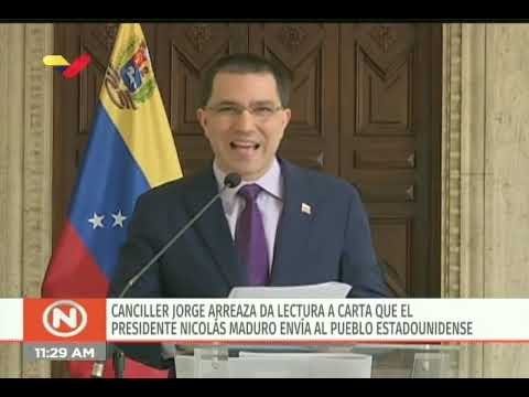 El canciller de la República Bolivariana de Venezuela, Jorge Arreaza, leyó este domingo una carta enviada por el Jefe de Estado, Nicolás Maduro al pueblo de Estados Unidos, donde insta a ponerle freno a lo que califica como un intento del presidente Donald Trump por instrumentalizar las instituciones de ese país para alcanzar sus objetivos electorales, basándose en infamias bajo pretexto de la lucha contra las drogas a través del cual ha ordenado el despliegue militar más grande hacia nuestra región en 30 años, en medio del combate contra la pandemia del Covid-19 que azota a la humanidad.