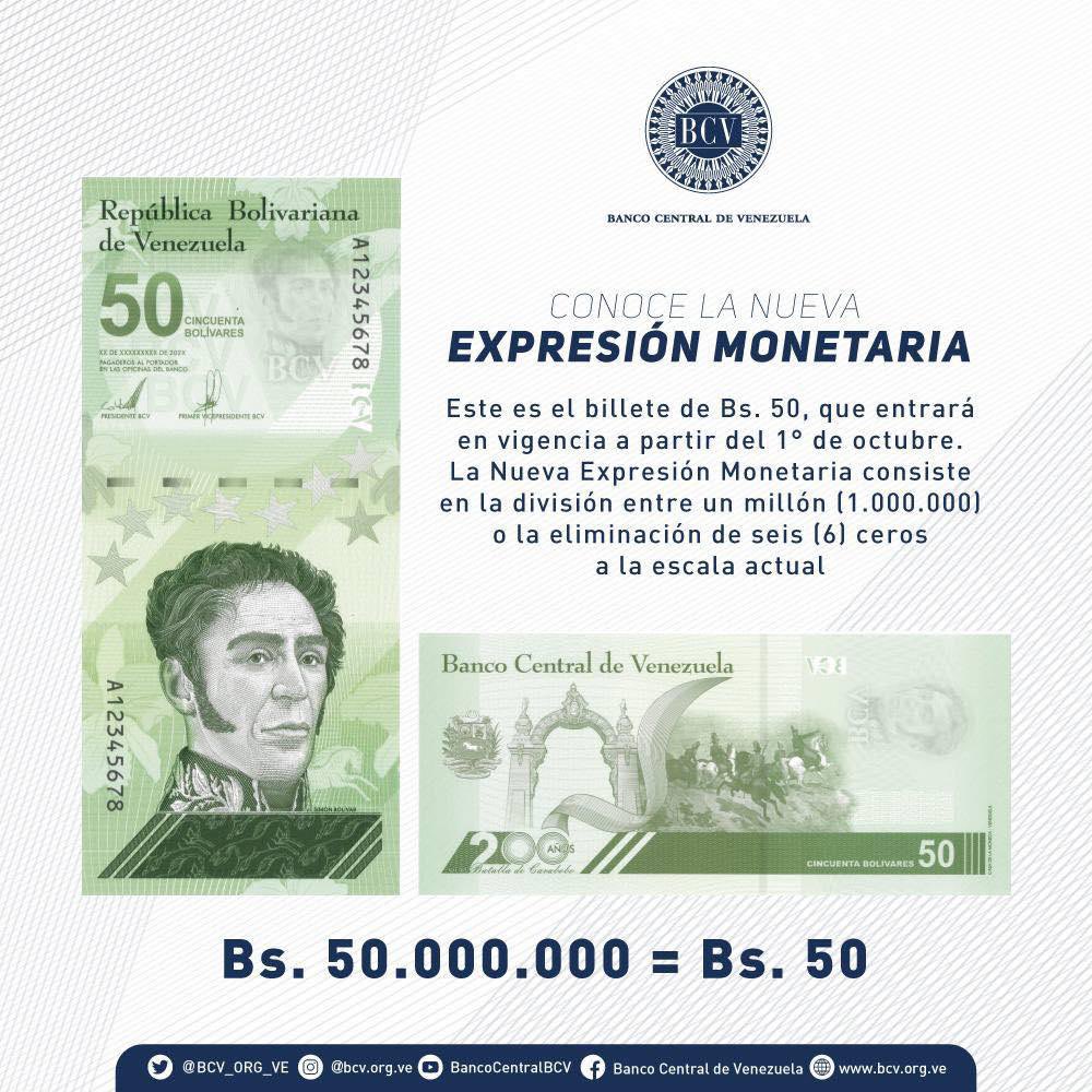 A partir del 1 de octubre entrará en vigencia el Bolívar Digital, con lo cual se eliminarán seis ceros a nuestra moneda nacional, informó el Banco Central de Venezuela (BCV), a través de un comunicado. En ese sentido, explicó que cualquier importe o transacción expresado en bolívares tendrá que dividirse entre 1 millón. El BCV indicó que este cambio en la escala monetaria busca profundizar en el desarrollo de la economía nacional, no afectándose el valor de nuestra moneda. El BCV también difundió imágenes de los nuevos billetes y la nueva moneda que estarán vigentes desde dicha fecha.