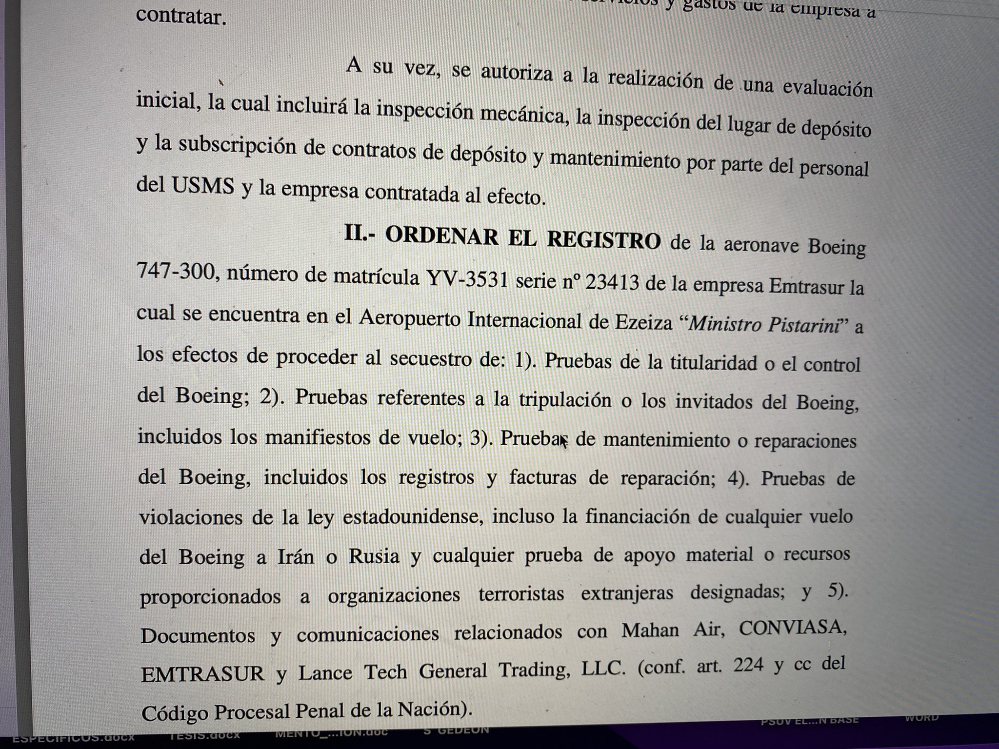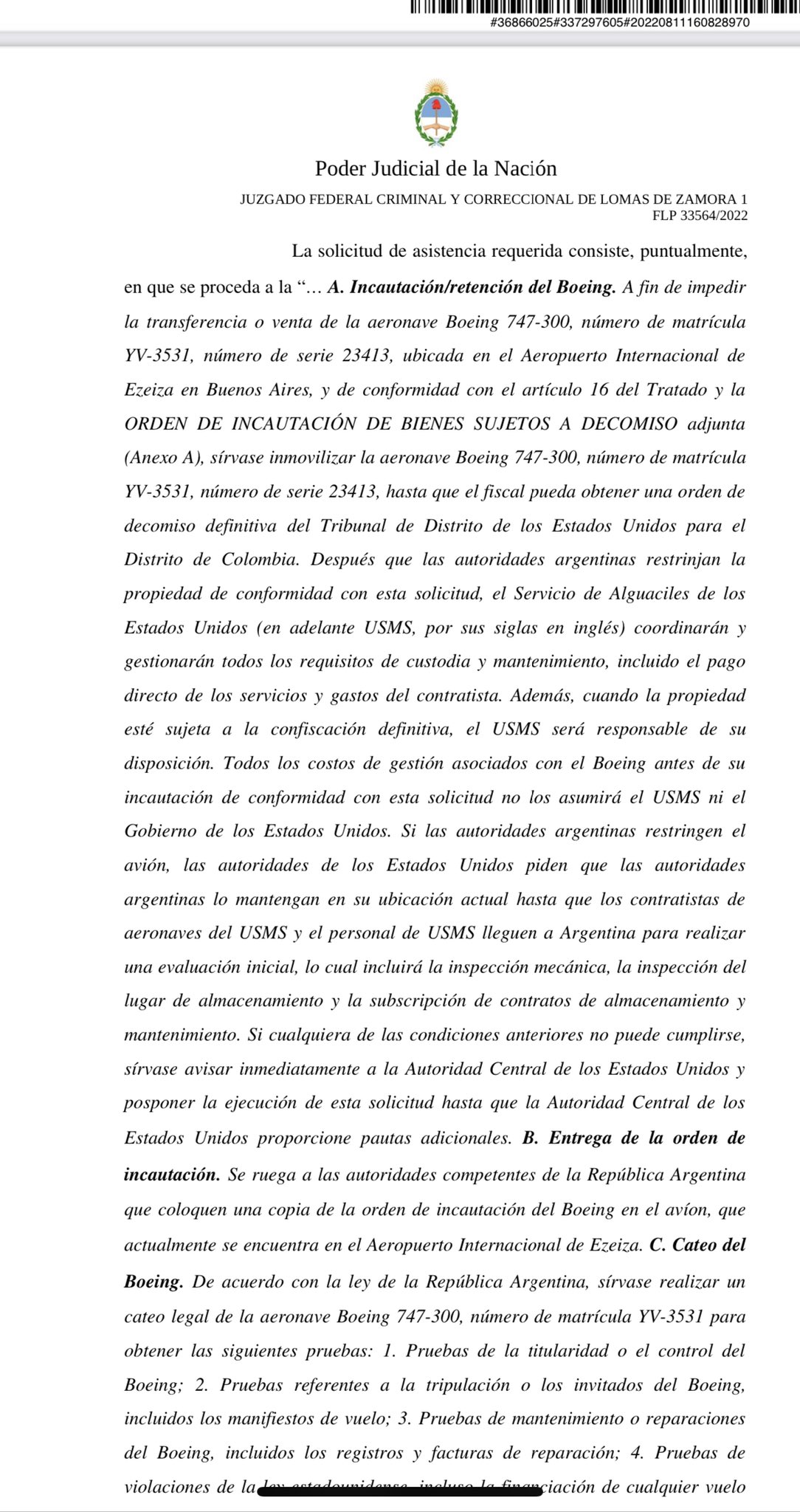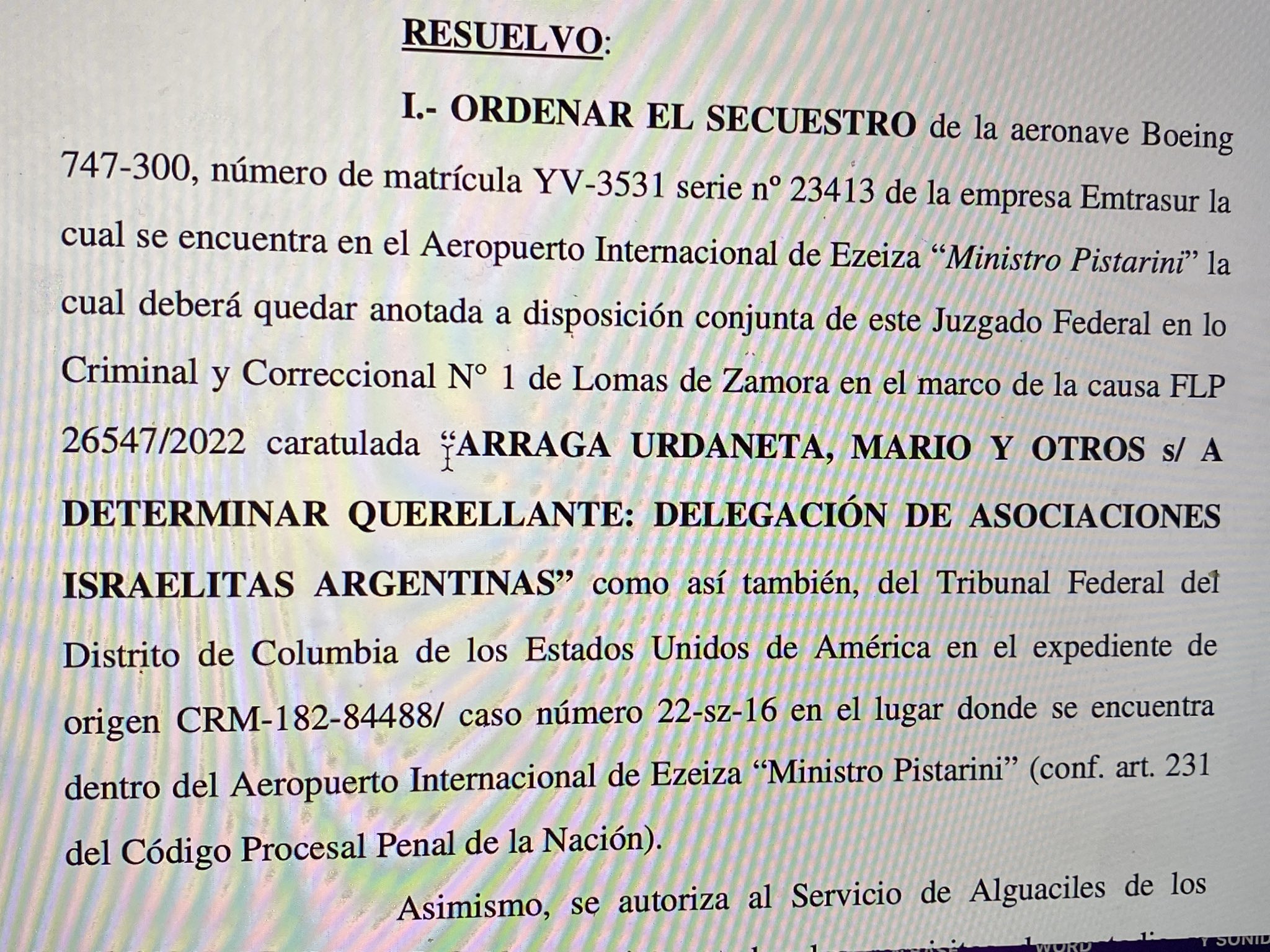 El juez federal de Lomas de Zamora (Argentina), Federico Villena, hizo lugar al pedido de las autoridades judiciales de Estados Unidos (EEUU) para incautar el avión Boeing de Emtrasur que ingresó a Argentina el 6 de junio. El fallo implica una ratificación del bloqueo norteamericano sobre la aeronave, en el marco del tratado de asistencia jurídica mutua entre ambos países. La información fue ofrecida por el sitio web Página 12.