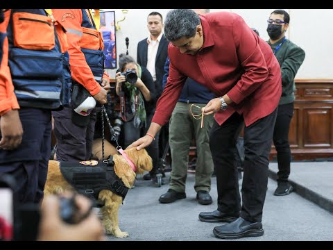Perrito condecorado durante la jornada de reconocimiento a los miembros de la Fuerza de Tarea Humanitaria Simón Bolívar. Foto: Prensa Presidencial