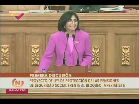 Durante la sesión de este jueves, la vicepresidenta Ejecutiva recalcó que ese proyecto de ley “va a abriendo camino en un hito histórico de lo que supone la superación del bloqueo criminal contra Venezuela”. El texto cuenta con 13 artículos y busca la protección especial de los pensionados, a través de aportes únicos y especiales por parte del empresariado.