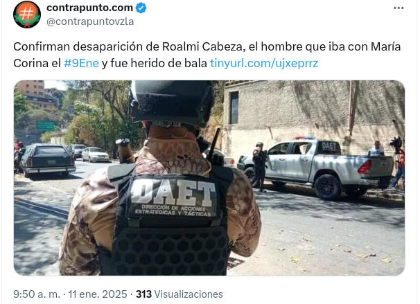 El Ministerio para Relaciones Interiores, Justicia y Paz informó este lunes sobre la detención de un ciudadano, de nombre Roalmi Cabeza, que manifestó encontrarse en “resguardo” por orden de la dirigente opositora María Corina Machado desde el pasado viernes. Según Machado y diferentes medios de oposición y organizaciones de derechos humanos, Cabeza supuestamente estaba en situación de “desaparición forzada” desde el día viernes. También decían que él había recibido un disparo en la pierna, pero al ser detenido en un hotel se le encontró bien de salud y sin ninguna herida en su cuerpo.