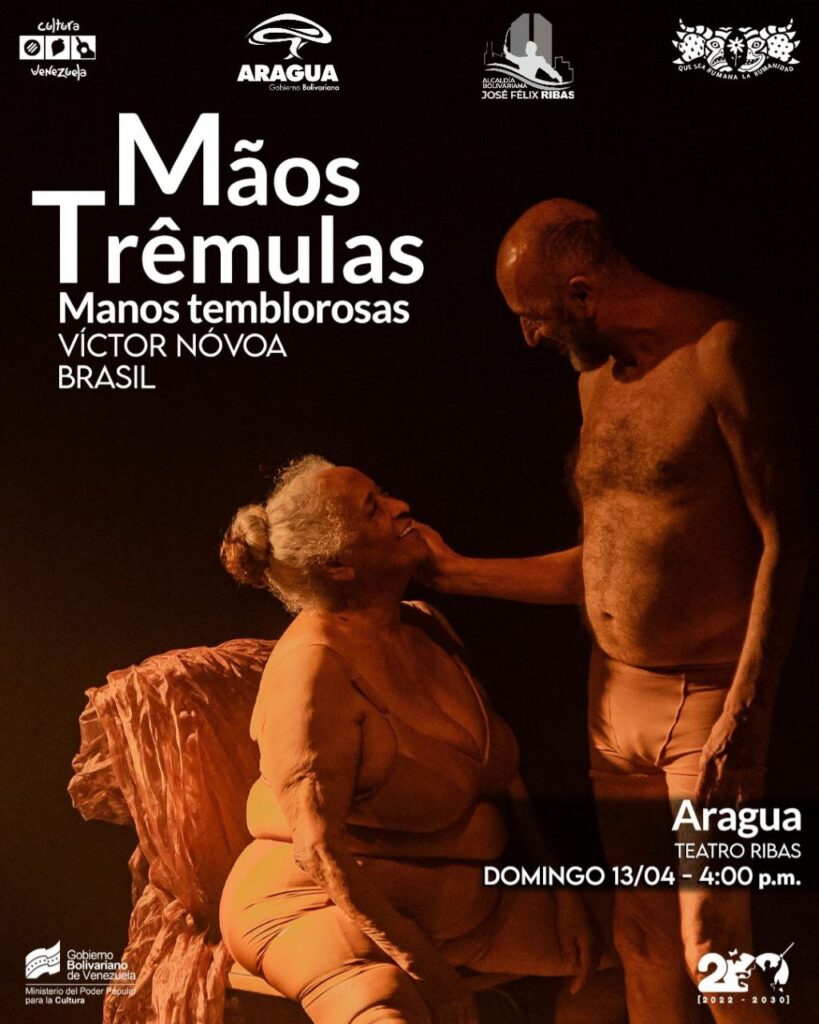 El estado Aragua contará con dos presentaciones: el domingo 13 de abril, a las 4:00 de la tarde, el Teatro Ribas de La Victoria, en el municipio Ribas, presentará la obra “Māos Trêmulas” (Manos temblorosas) a cargo de Víctor Novoa de Brasil. Esta pieza teatral nos acerca a la vida de un hombre y una mujer mayores de 80 años que, tras la pérdida de sus seres queridos, exploran sus recuerdos íntimos en un contexto social que revela las diversas formas de violencia ejercidas por la lógica hegemónica del capitalismo sobre el cuerpo que envejece, priorizando la eficiencia y el rendimiento.