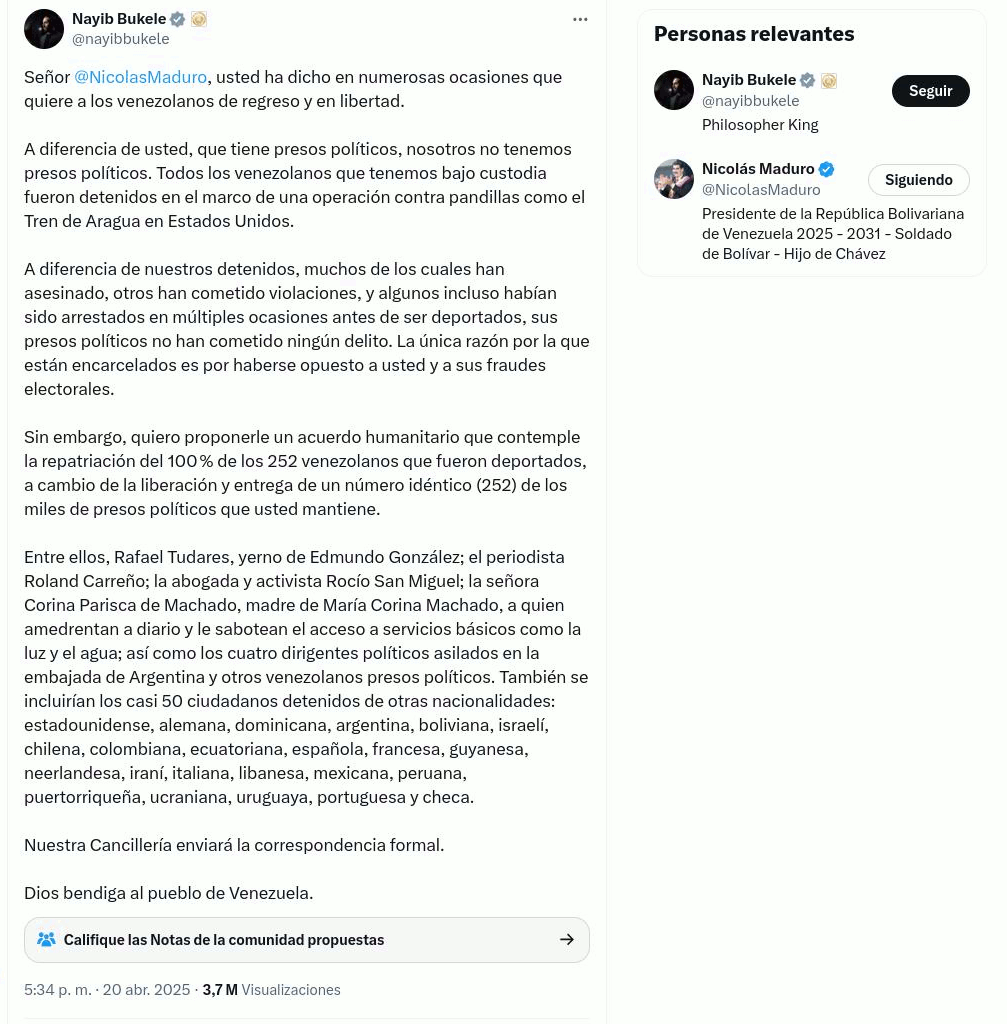 Dijo Bukele este domingo en la noche, en su cuenta en X, en un mensaje público dirigido al Presidente de Venezuela, Nicolás Maduro: “Quiero proponerle un acuerdo humanitario que contemple la repatriación del 100 % de los 252 venezolanos que fueron deportados, a cambio de la liberación y entrega de un número idéntico (252) de los miles de presos políticos que usted mantiene”.