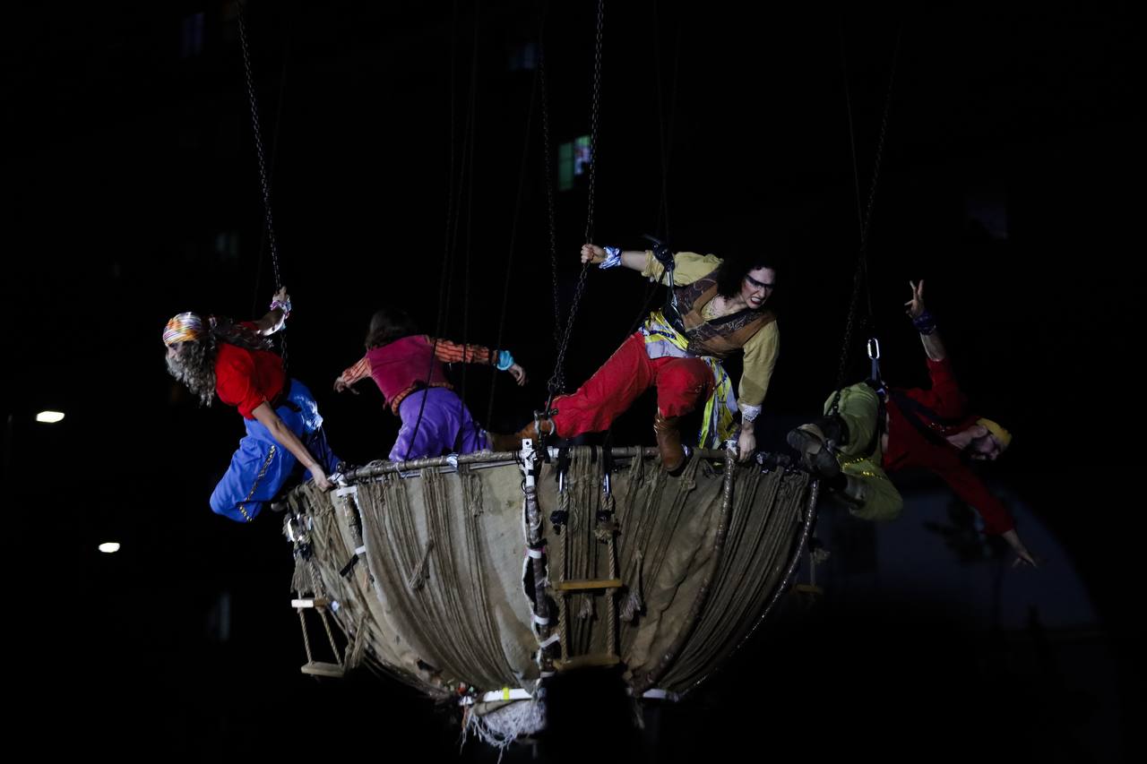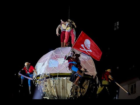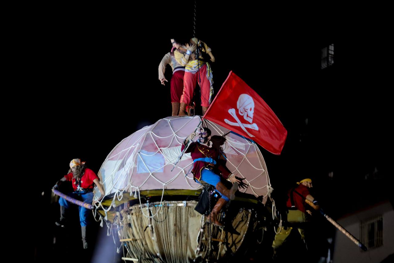 Una tarima con forma de nave pirata de la que se desprendían personajes como Campanita, Peter Pan, Garfio y los piratas flotó durante unos 30 minutos sobre cientos de personas que se dieron cita en la Plaza de la Juventud.