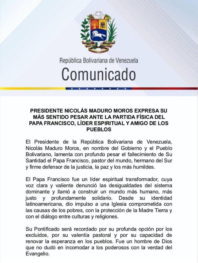 El Presidente de Venezuela, Nicolás Maduro, publicó este lunes un comunicado lamentando el fallecimiento de Jorge Mario Bergoglio, el papa Francisco de la Iglesia Católica. En el texto resaltó que fue un firme defensor de la justicia, de la paz y de los más humildes.