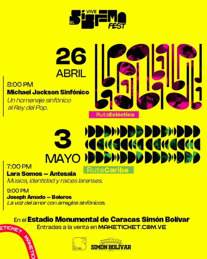 Michael Jackson Sinfónico, Joseph Amado Boleros Sinfónicos y El Sistema Latin All Stars se realizarán en el Estadio Monumental de Caracas Simón Bolívar los sábados 26 de abril, 3 de mayo y 10 de mayo con un aforo para 13.000 venezolanos que deseen disfrutar de la calidad de la música hecha en el país.