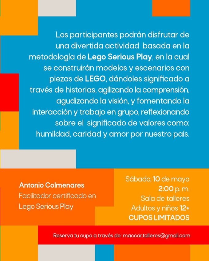 Este sábado 10 de mayo de 2025 a las 2 de la tarde se realizará el taller “Arma y desarma: Lego para pensar” por Antonio Colmenares, facilitador certificado en “Lego Serious Play”, en el Museo de Arte Contemporáneo Armando Reverón (Maccar) en Caracas.