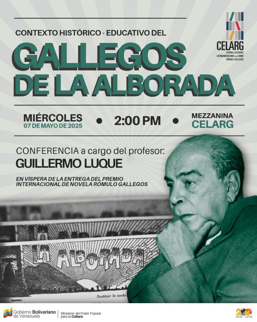 El profesor Luque ofrecerá su visión experta sobre el contexto histórico y educativo que permeó la obra de Rómulo Gallegos, especialmente en relación con su emblemática novela “La Alborada”, una pieza clave que refleja las tensiones sociales de la Venezuela de principios del siglo XX y donde se vislumbran las ideas políticas y pedagógicas de este autor venezolano en torno al rol de la educación en la construcción de una nueva nación.