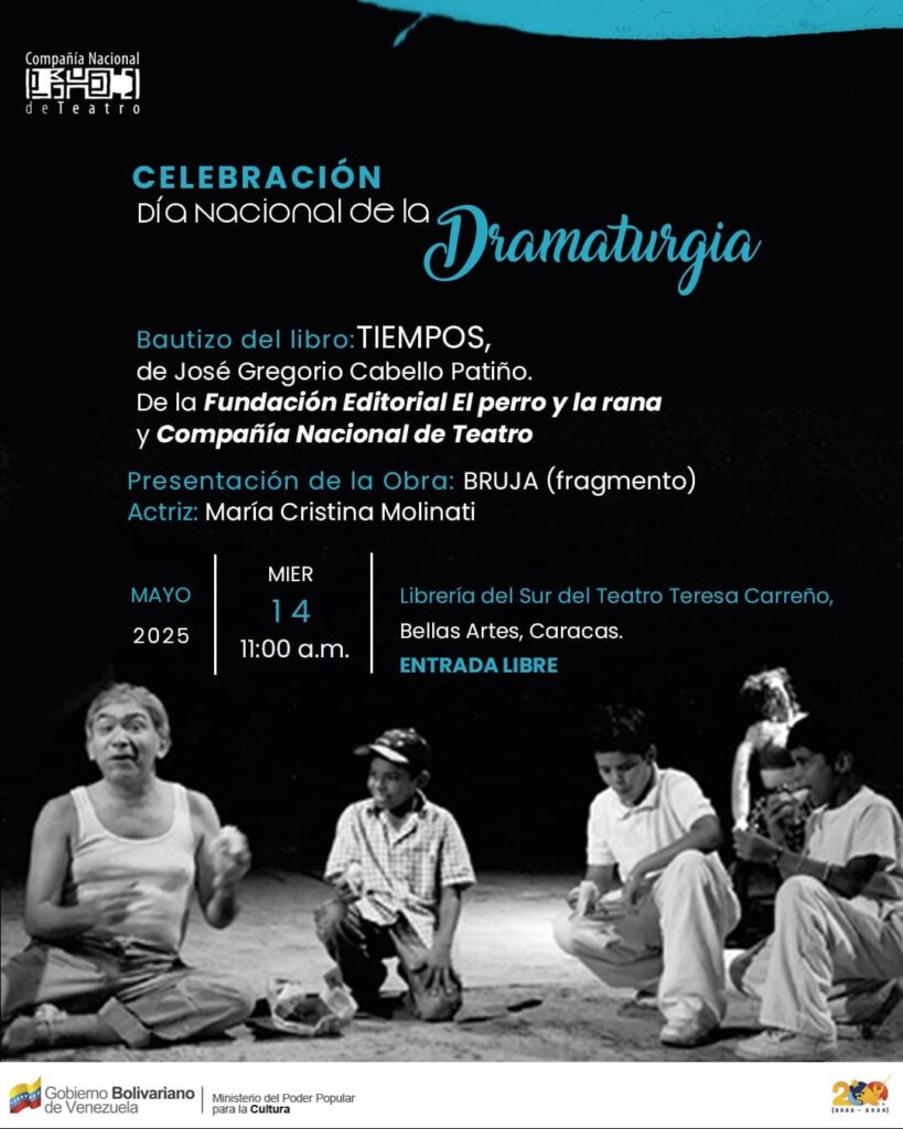 El Ministerio del Poder Popular para la Cultura, a través de la Compañía Nacional de Teatro (CNT) y la Fundación Editorial El Perro y La Rana, invita a la celebración del Día Nacional de la Dramaturgia el miércoles 14 de mayo, a las 11:00 de la mañana, en la Librería del Sur del Teatro Teresa Carreño, en Caracas para el bautizo del libro “Tiempos”, del destacado dramaturgo José Gregorio Cabello Patiño, con un prólogo escrito por Roberto Azuaje. La entrada será libre.