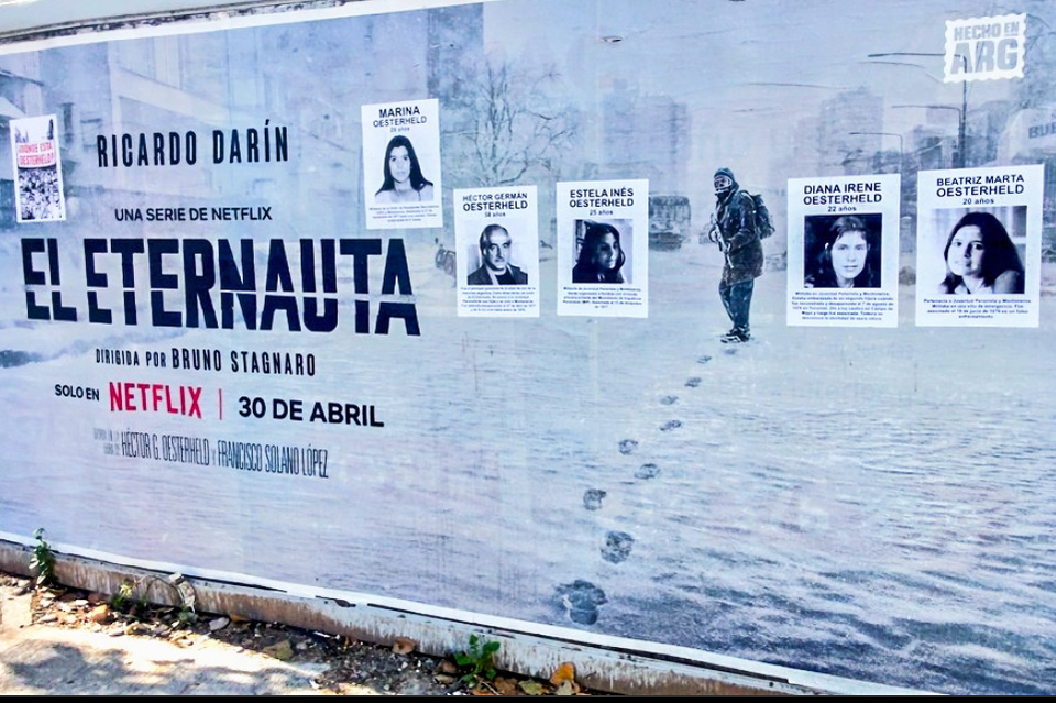 La ciudad de Buenos Aires, escenario de la invasión que narra El Eternauta, está empapelada con afiches de la serie de Netflix que dirige Bruno Stagnaro y protagoniza Ricardo Darín.