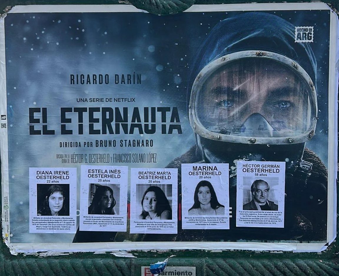 Activistas argentinos colocaron volantes o papeles con la historia de Héctor Germán Oesterheld y sus cuatro hijas, encima de la publicidad de Netflix de la serie “El Eternauta” en las calles de Buenos Aires. Foto: Reddit