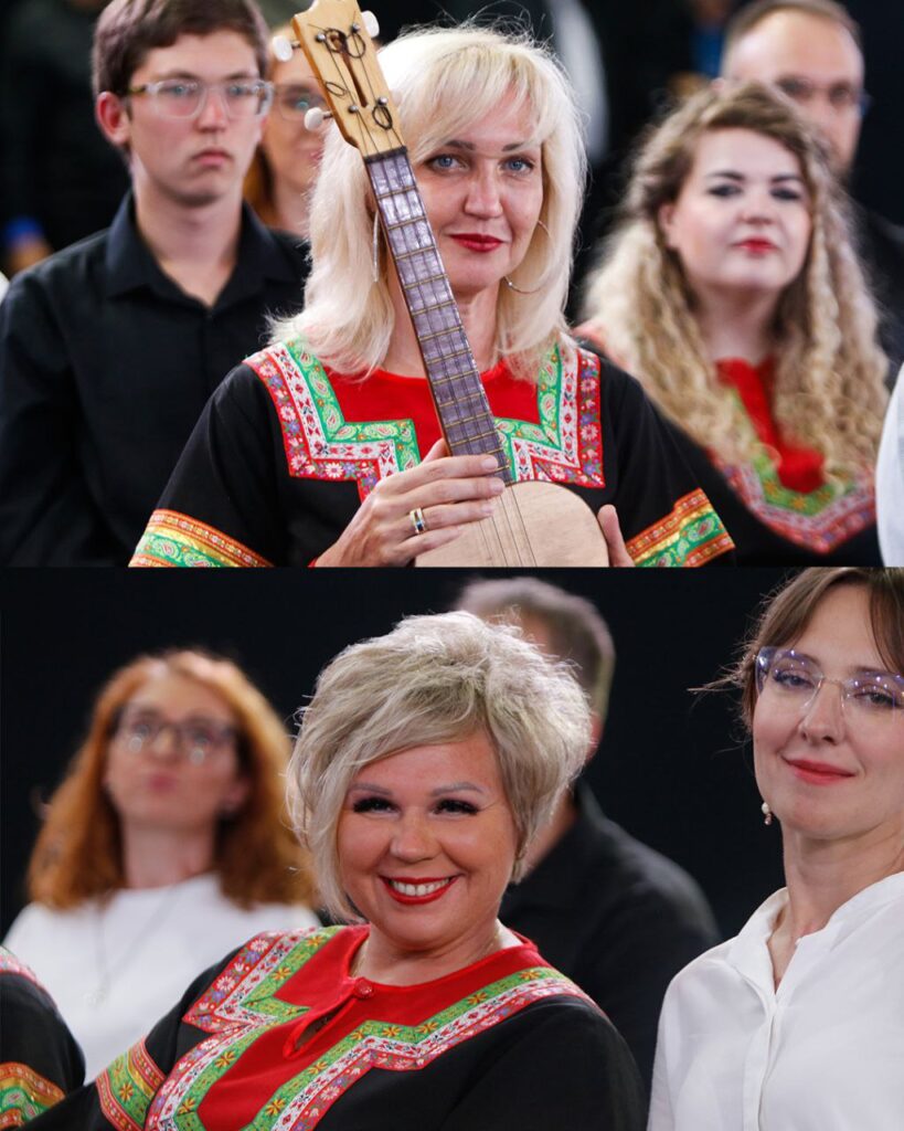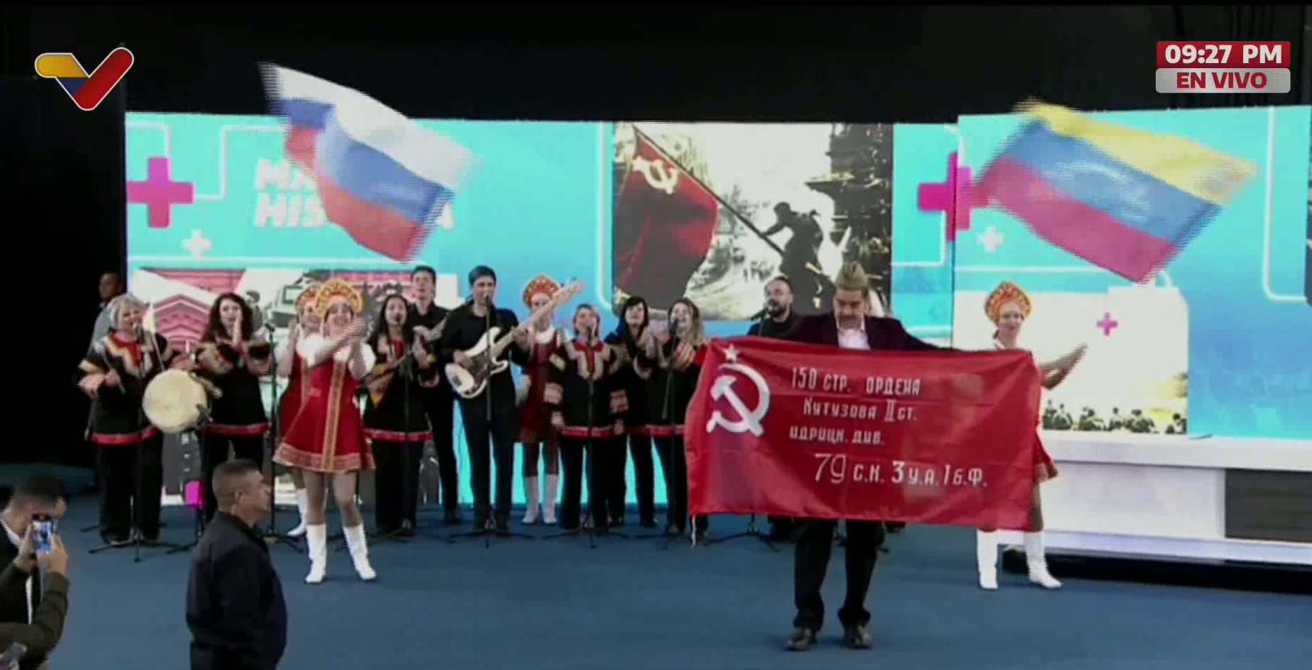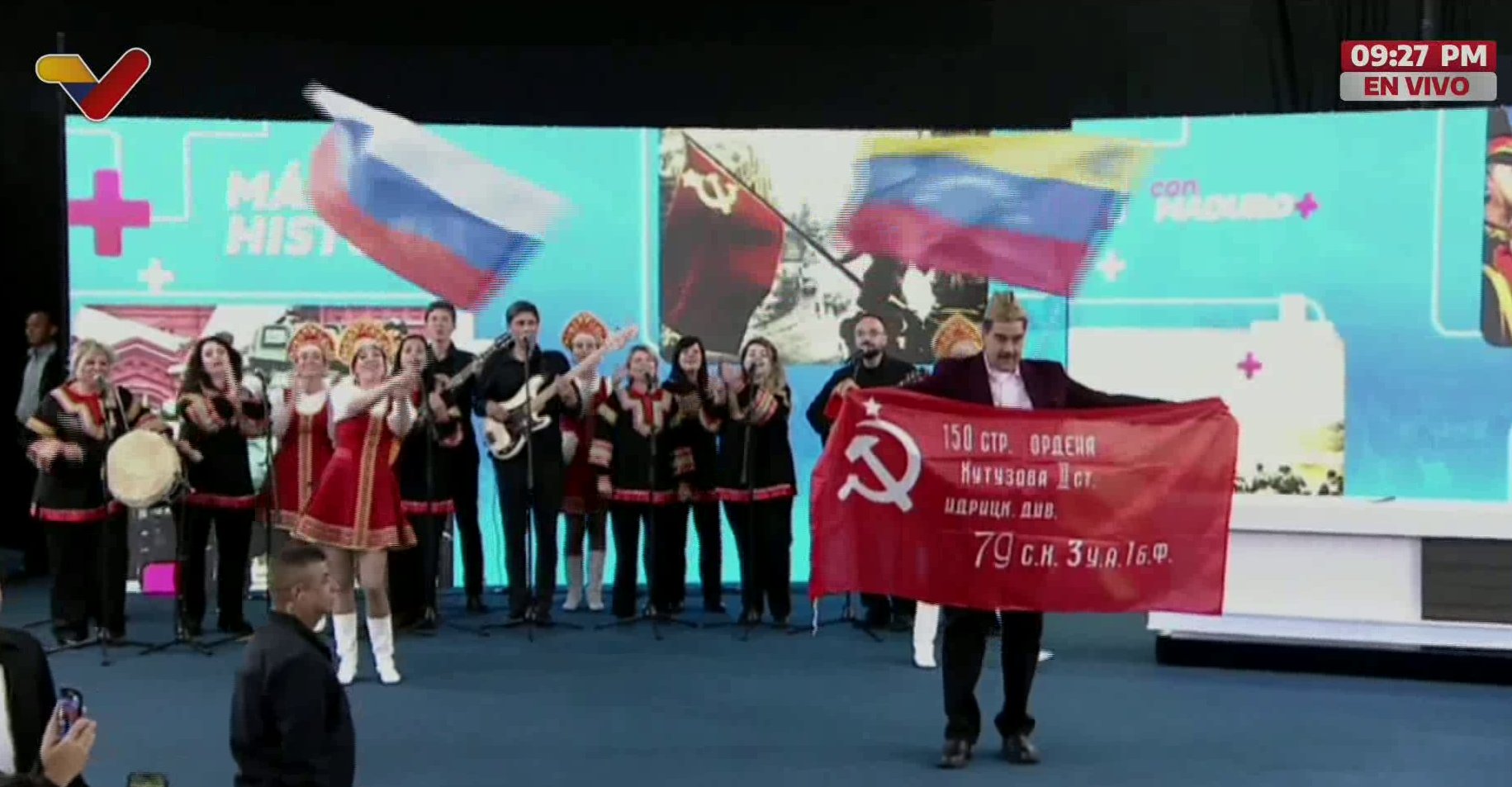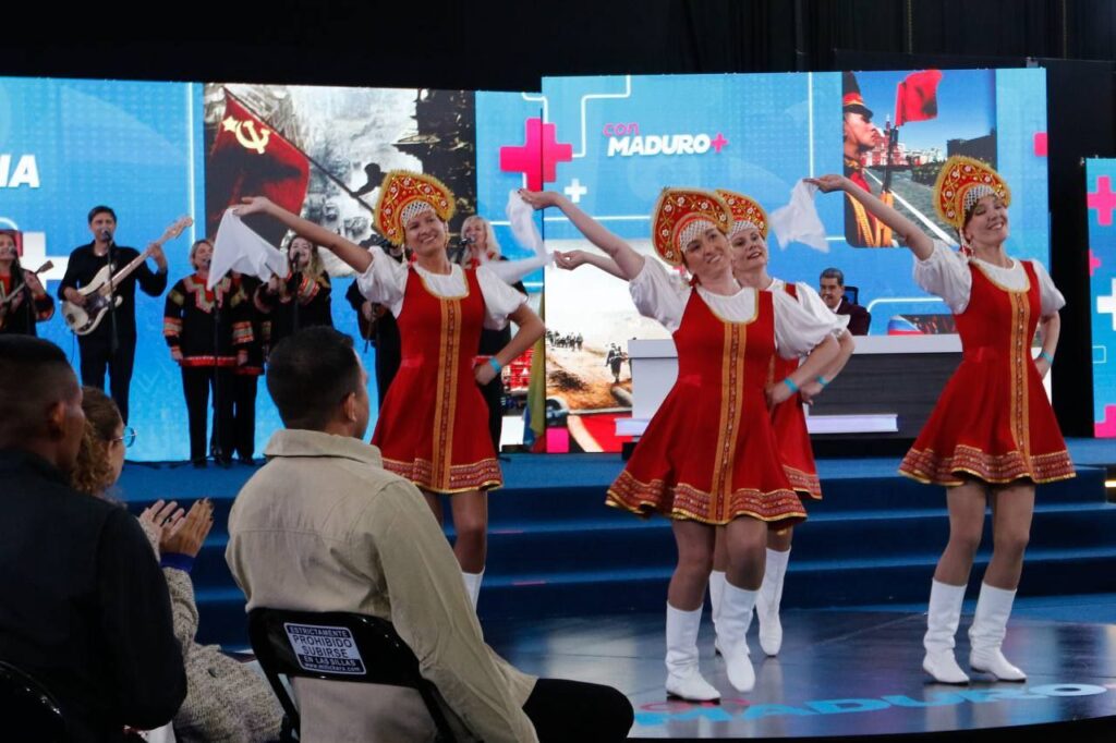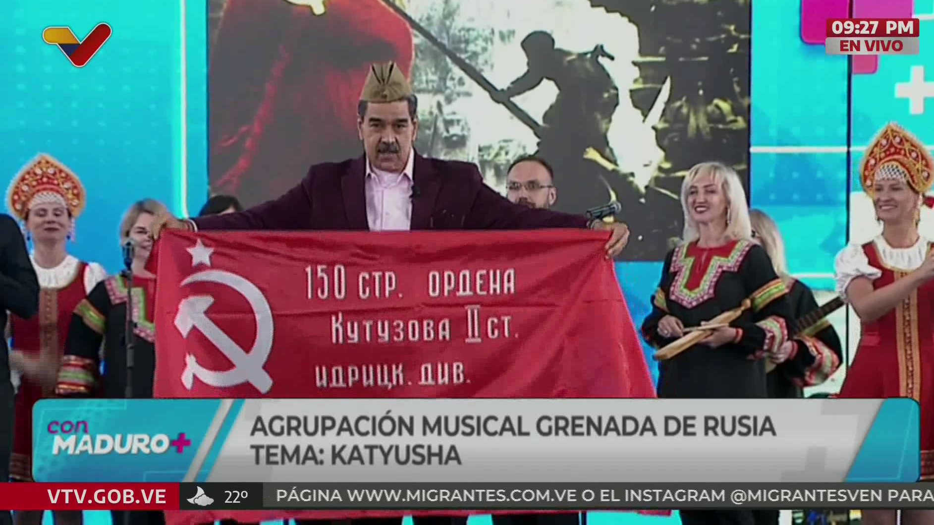 El Presidente Maduro recibió de la delegación rusa presente en el programa “Con Maduro+” una réplica de la bandera del Ejército Rojo y una gorra auténtica de un combatiente de dicho ejército. El Grupo Granada de Rusia amenizó el programa con “Katiusha”, canción soviética muy célebre durante la Segunda Guerra Mundial, sobre una chica que añoraba a su amado, que estaba en el servicio militar.