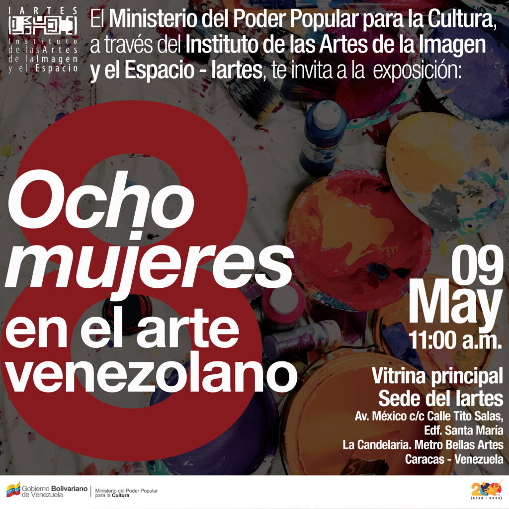 El Instituto de las Artes de la Imagen y el Espacio (Iartes), ente adscrito al Ministerio del Poder Popular para la Cultura (MPPC), extiende una cordial invitación a la inauguración de la exposición “8 Mujeres en el Arte Venezolano”, el viernes 9 de mayo, a las 11:00 a.m., en las vitrinas expositoras ubicadas en la entrada principal de la institución en Bellas Artes, Av. México con calle Tito Salas, Edificio Santa María. La Candelaria.