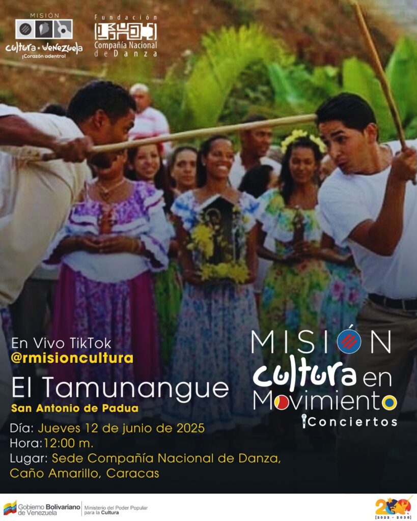 Misión Cultura en Movimiento, a través de su iniciativa “Conciertos”, se une a la celebración de la víspera de San Antonio de Padua este jueves 12 de junio, a partir de las 12 del mediodía, presentando la manifestación tradicional popular El Tamunangue.