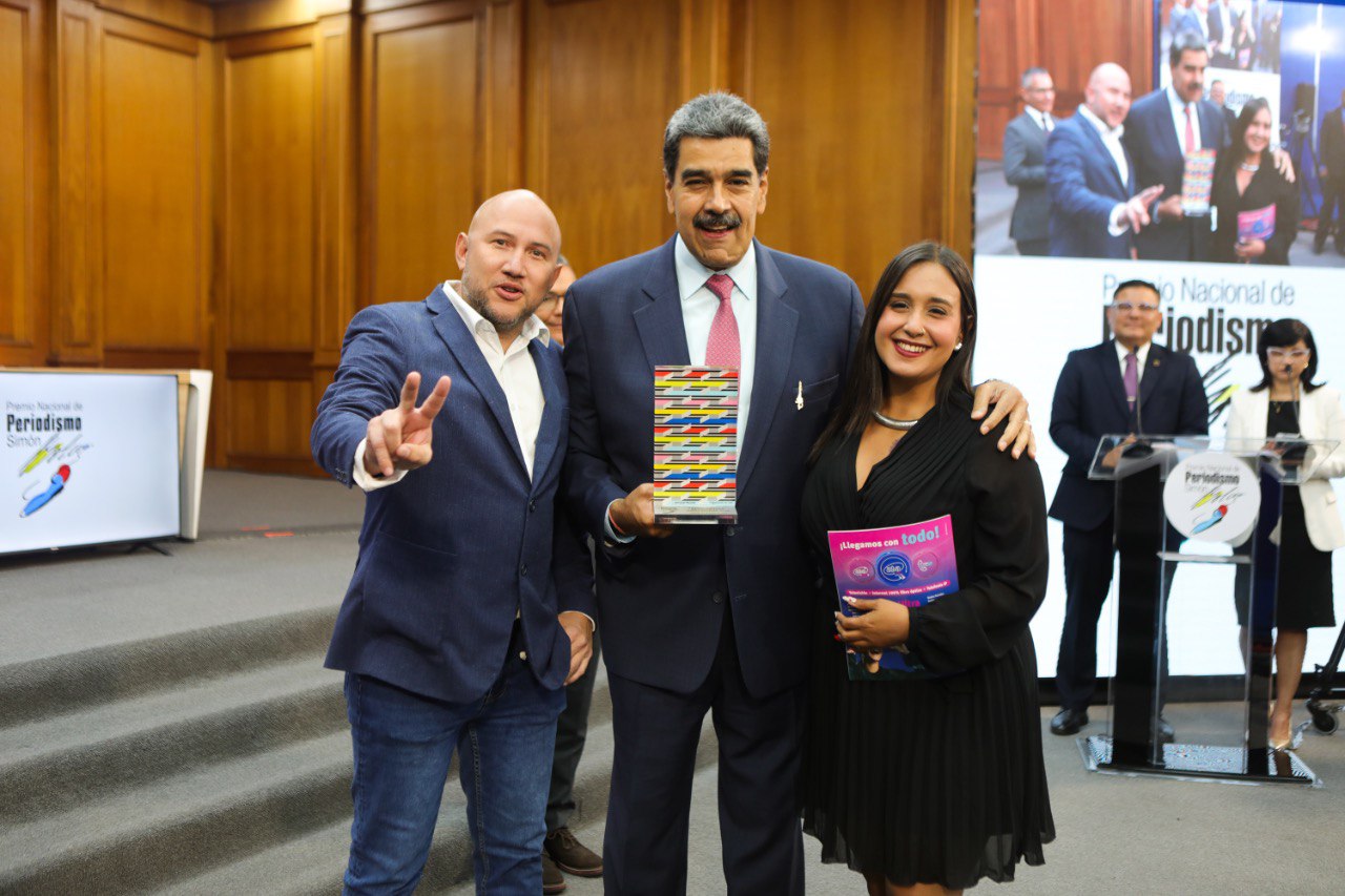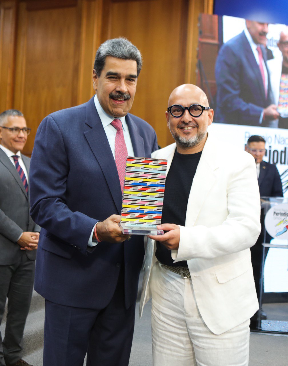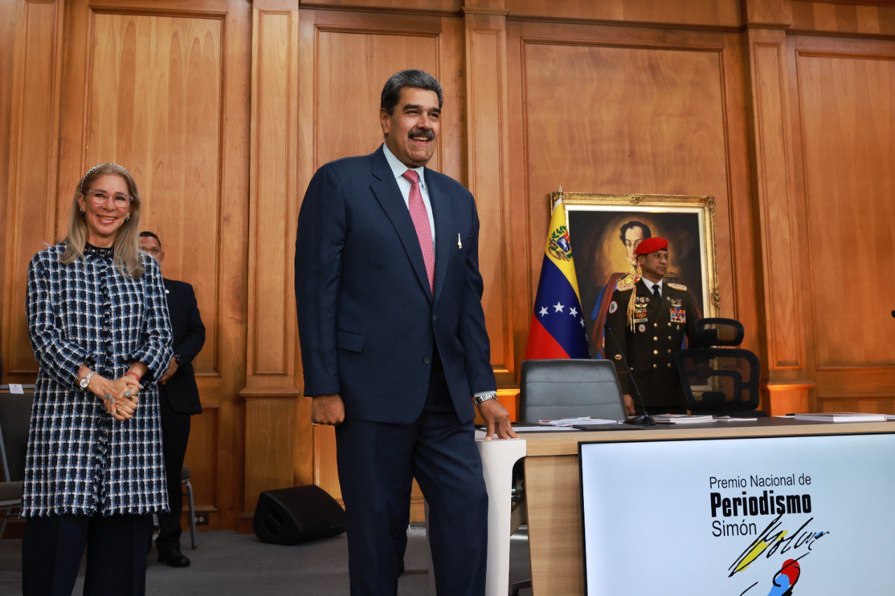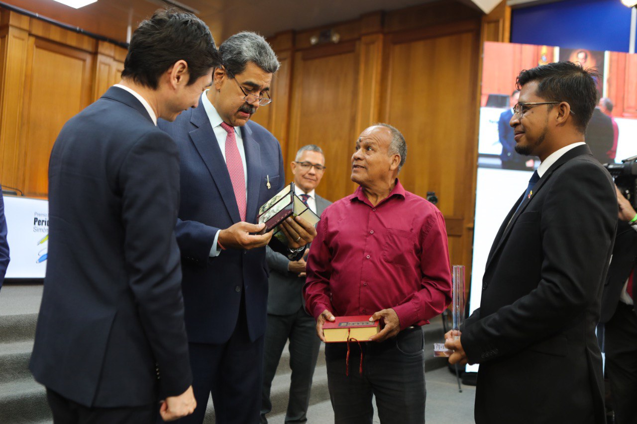 Desde el Salón Ayacucho, el presidente de la República, Nicolás Maduro, lideró el acto de entrega del Premio Nacional de Periodismo Simón Bolívar 2025; como parte del reconocimiento que se le otorga cada año a los profesionales del área, por la trayectoria en el ejercicio profesional y en el cumplimiento de la doctrina y principios éticos de la defensa como norma irrenunciable en el buen periodismo.