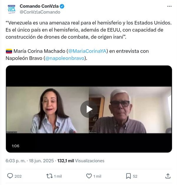 “Venezuela es una amenaza real para el hemisferio y los Estados Unidos. Es el único país en el hemisferio, además de EEUU, con capacidad de construcción de drones de combate, de origen iraní”. Así lo afirmó la dirigente de extrema derecha María Corina Machado, quien, en una entrevista con Napoleón Bravo, y en una situación de conmoción mundial causada por la agresión de Israel contra Irán, la exdiputada pareciera dar razones a Estados Unidos para actuar militarmente contra Venezuela.