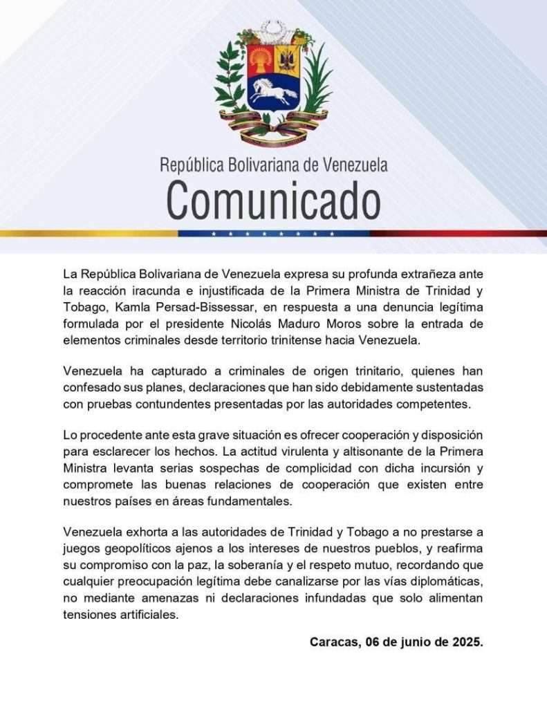 El ministro del Poder Popular de Relaciones Exteriores, Yván Gil, manifestó que resulta «iracunda e injustificada» la reacción de la ministra de Trinidad y Tobago, Kamla Persad-Bissessar, frente a la denuncia legítima hecha por el presidente Nicolás Maduro Moros, en relación al ingreso de elementos criminales desde territorio trinitense hacia Venezuela.