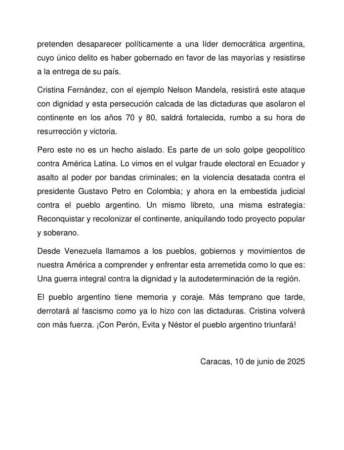 En la misiva le desean fuerza y perseverancia a la exmandataria argentina, de quien aseguran que “resistirá este ataque con dignidad”. Aclara que este ataque contra Cristina Fernández, no es un hecho aislado, y que se suma al “vulgar fraude electoral en Ecuador” y a “la violencia desatada contra el presidente Gustavo Petro en Colombia”.