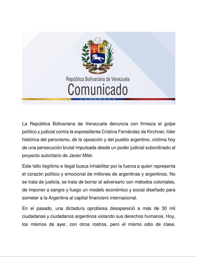 El gobierno de la República Bolivariana de Venezuela rechazó de manera categórica el “golpe político y judicial” que se fraguó este martes contra la expresidenta argentina Cristina Fernández de Kirchner, en el cual se le condenó por supuesta corrupción y se le impidió su participación política de por vida.