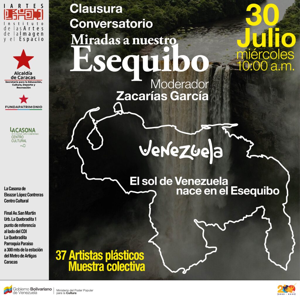 El Instituto de las Artes de la Imagen y el Espacio (Iartes) se complace en invitar a la comunidad artística y al público en general a la clausura de la muestra colectiva “Miradas a nuestro Esequibo”, a efectuarse este miércoles, 30 de julio, a las 10:00 a.m. en el Centro Cultural La Casona Eleazar López Contreras.