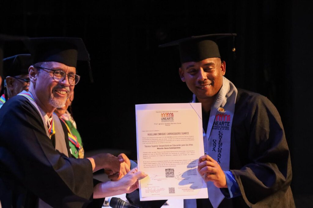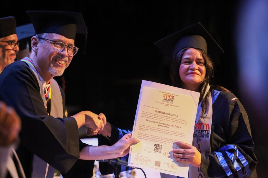 Por su parte, María de los Ángeles Maldonado, quien recibió su título en la mención Danzas Tradicionales, compartió su emoción: “Veo familiares orgullosos, amigos invaluables, es un privilegio, un hito que marca el cierre de un capítulo y el vibrante inicio de otro. Los pasillos de la Unearte celebran una nueva cosecha”. Maldonado resaltó cómo en su trayectoria exploraron mundos y escucharon voces propias, logrando “armonizar la técnica con la expresión”.
