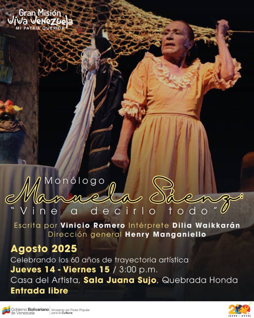 El Ministerio del Poder Popular para la Cultura invita a celebrar los 60 años de vida artística de la primera actriz del teatro y la televisión venezolana, Dilia Waikkarán este jueves 14 y viernes 15 de agosto, en la sala Juana Sujo de la Casa del Artista, a las 3 de la tarde, con la presentación de su monólogo “Manuela Sáenz vine a contarlo todo” del dramaturgo e historiador Vinicio Romero y con la dirección de Henry Manganiello.