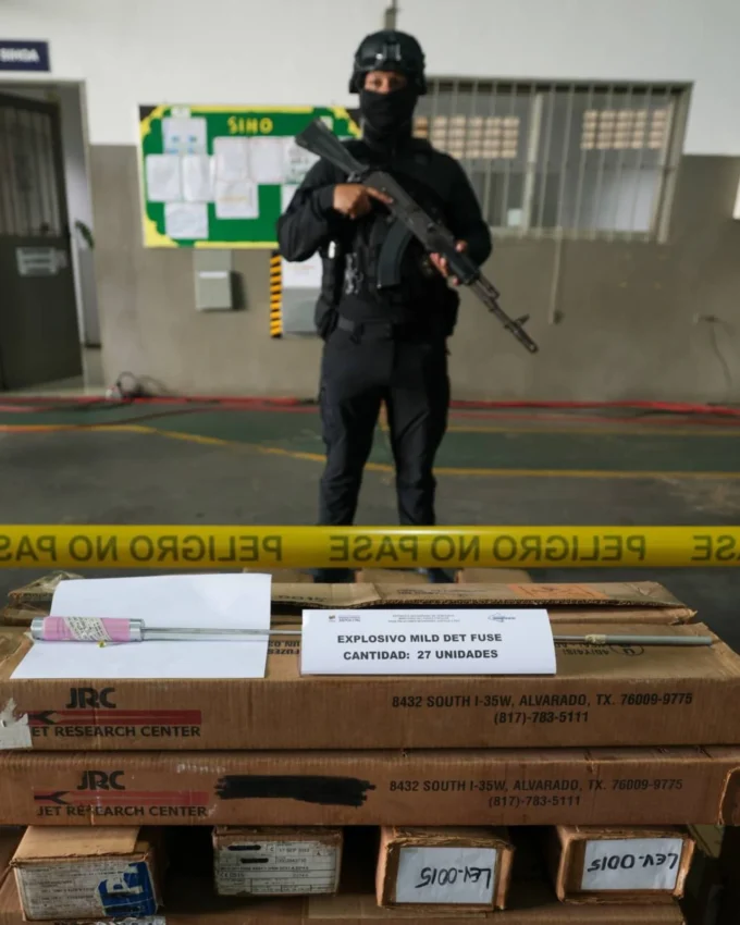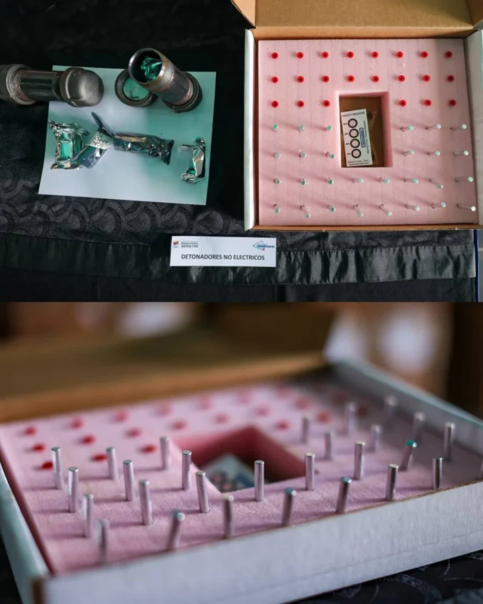 Mostró un detonador de 18 kilos que contiene HMK, un explosivo de rápida difusión. “En un segundo, la onda expansiva de esto alcanza 9,1 kilómetros”. Asimismo, precisó que en caso de explotar todo el material incautado tendría un impacto letal de 911 metros y las esquirlas llegarían a 1.200 metros.