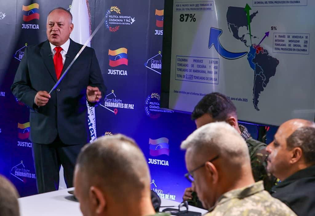 El vicepresidente sectorial de Política, Seguridad Ciudadana y Paz, Diosdado Cabello, afirmó este lunes que el 87% de la droga producida en Colombia sale por el Pacífico, citando cifras de un informe de Naciones Unidas. Presentó varias cifras sobre el avance de las operaciones realizadas en el decomiso de drogas y la destrucción de campamentos ilegales utilizados por organizaciones delictivas.